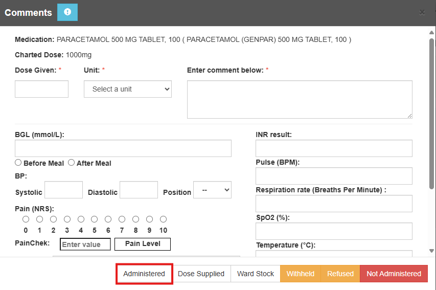 - Once you administer the PRN meds, click Comment to record the details. For example, the dose administered if a range is charted.