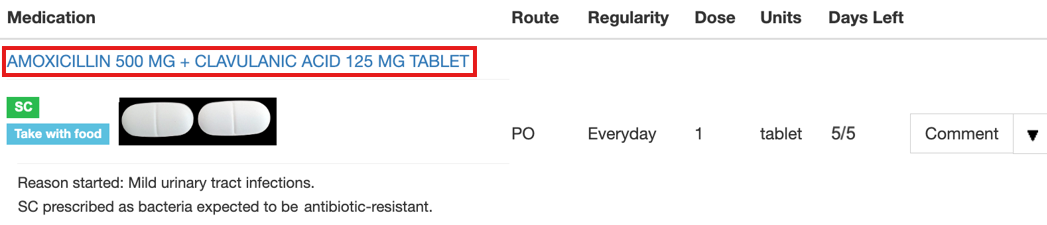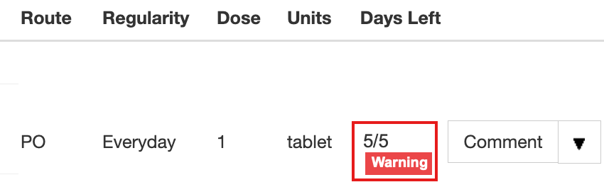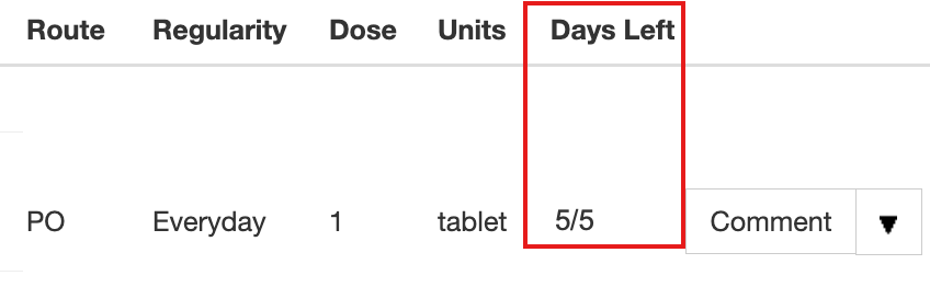 - Days Left shows the remaining days of the meds course. It begins counting down from the first dose actioned in MediMap,