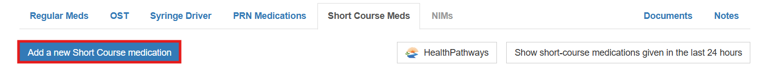 Go to the meds round you want to administer. Short course meds show with regular meds at the charted dose time, marked as SC.