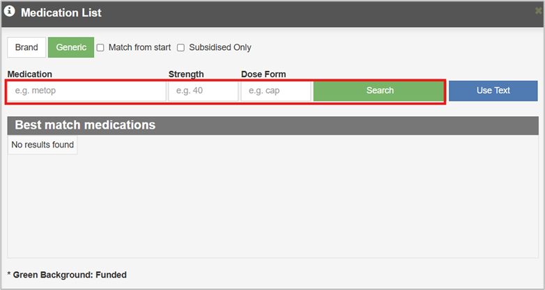 - Type in the name of the medication (or part of the medication name), click Search (strength and dose form are optional).