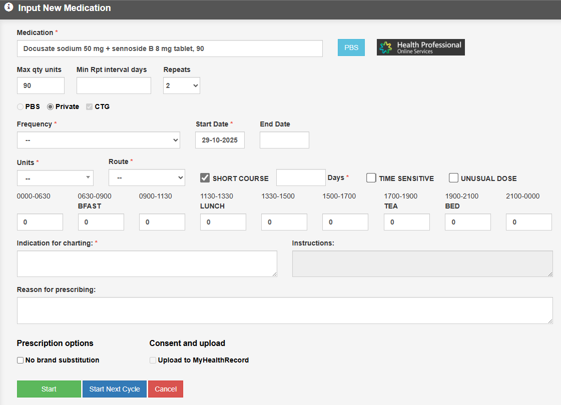 Complete the Input New Medication window and click on Start or Start Next Cycle