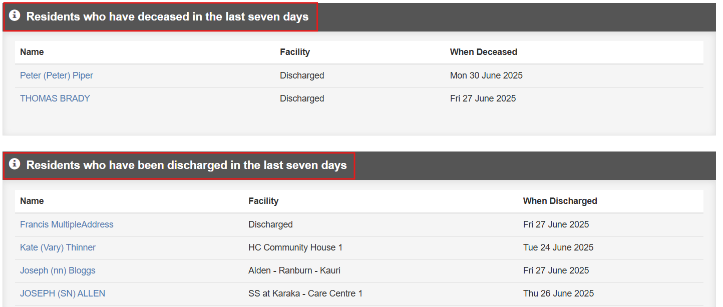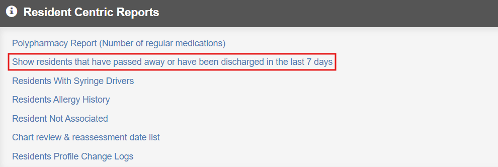 Reporting on deceased or discharged residents Print Article From the Dashboard click on Reports. Under Resident Centric Reports click on Show residents that have passed away or have been discharged in the last 7 days. The report will list the residents grouped under deceased and discharged.Version 1.0 Related articles Discharge a resident or mark as deceased or offsite User Guide - Reports Administration history of a medication Supplying doses in advance Patient not visible on administration page
