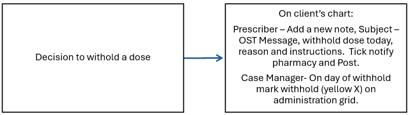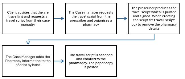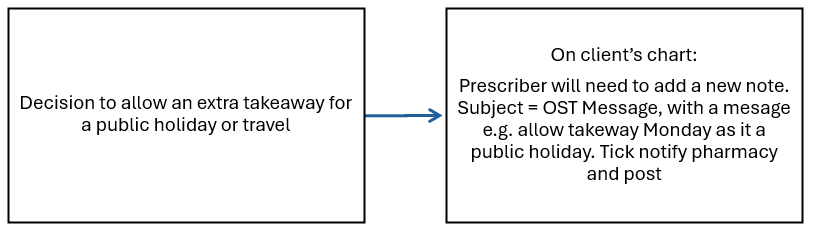 Travel Script Process - Addiction Services Print Article Messaging the PharmacyWithhold a doseReleasing the doseOne off takeaway for a public holiday or travel(All permanent takeaway changes must be changed in the chart by the prescriber) Version 1.0 Related articles Drug Testing Form - Addiction Services Removing a client from the clinic - Addiction Services OST administered report Multiple Pharmacy Suppliers - Addiction Services Forgotten Password