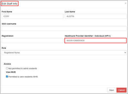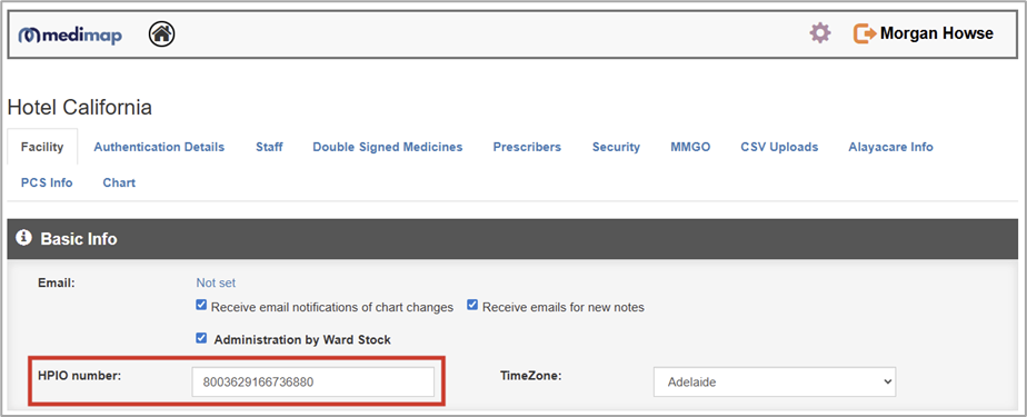 Adding HPI-I and HPI-O numbers quick reference guide Print Article Go to settings.Under the Facility tab > Basic Info add the HPI-O number.Under the Staff tab click on the edit button for each registered nurse,Add their HPI-I number.August 2025 Related articles Aged care transfer summary FAQs Aged care transfer summary quick reference guide Release Notes 3.3.4 Release Notes 3.4.6 System Status
