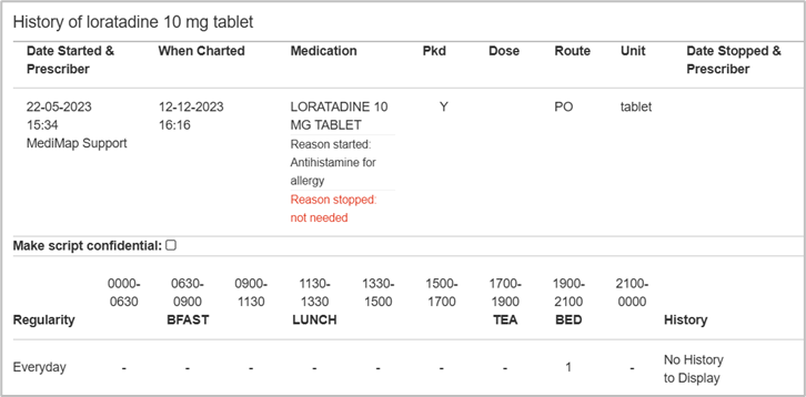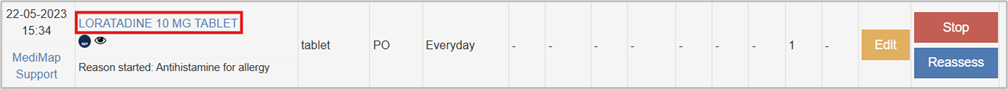 Click on the name of any medication (Blue text) and the charting history displays.