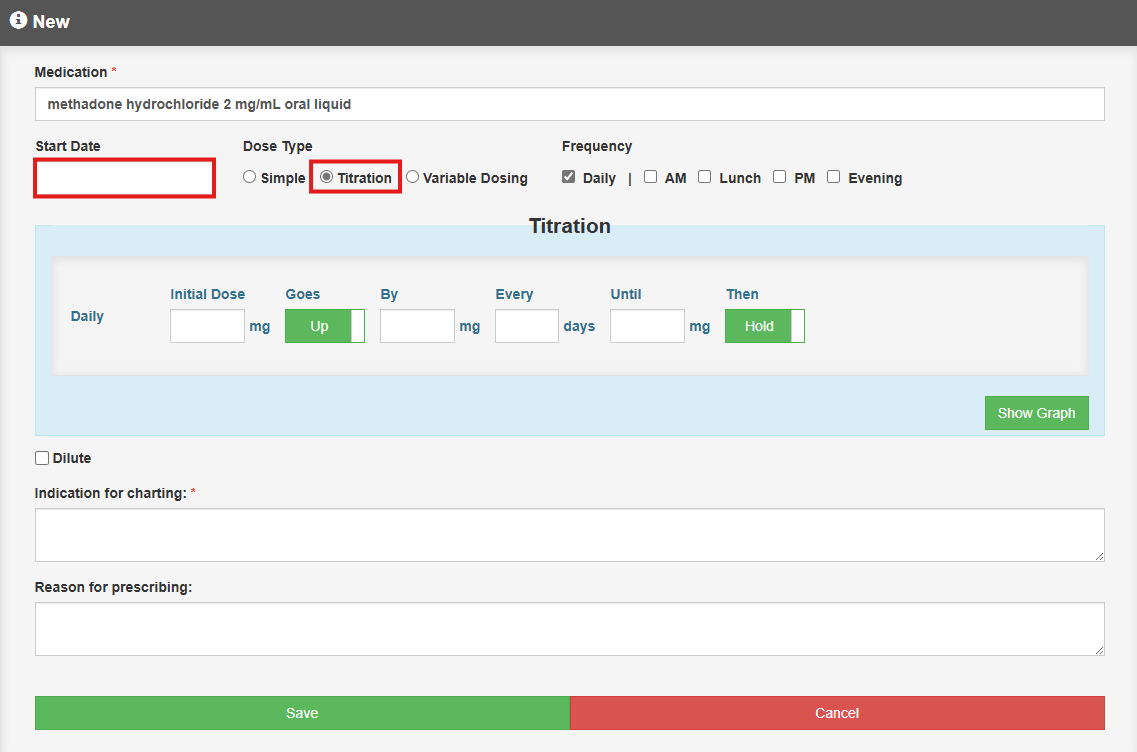 - Start Date – select the start date and the dose type as Titration