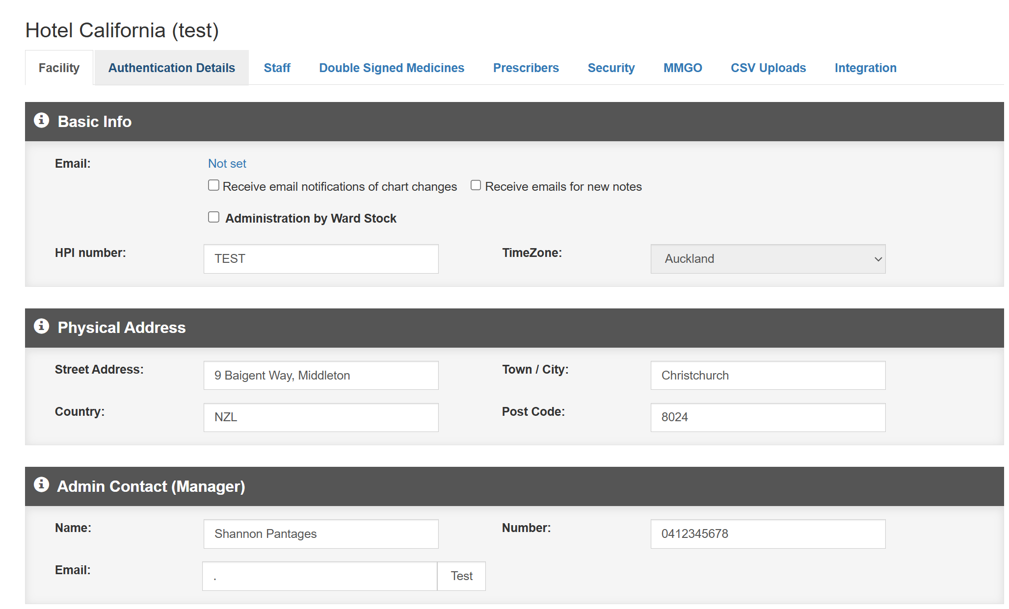 Settings - Facility tab Print Article Click on the Settings icon.Click on the Facility tabKeep the care facility contact details up to date so that MediMap will know who to notify of updates and changes.Version 1.0 Related articles User Guide - Facility User Guide - Clinical Support Manager Manage ward stock - stocktake Settings - Details tab eCase Integration FAQ