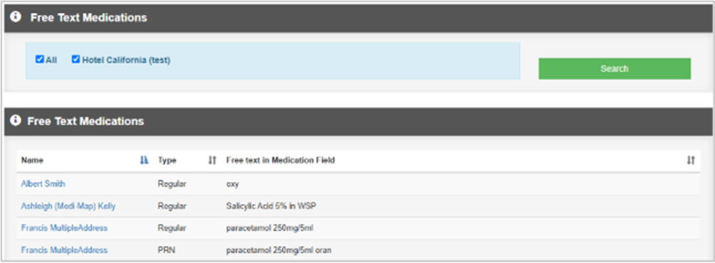 This report shows all residents with Free Text items prescribed on their chart. Free Text should not be used for medications; these should be selected by the prescriber from the medicines list.