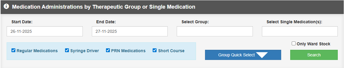 - Click on Medication Administrations by Therapeutic Group or Single Medication.