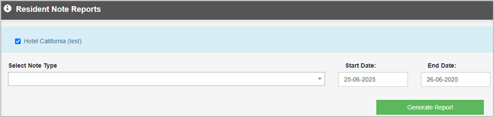 This report displays a selected note type/s for the facilities you are looking at e.g. Hospital Admissions etc, select date range and click generate report.