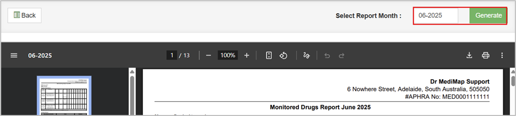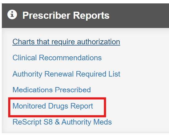 The report will display the monitored drugs prescribed to your residents including schedule 4 restricted and schedule 8 medications.