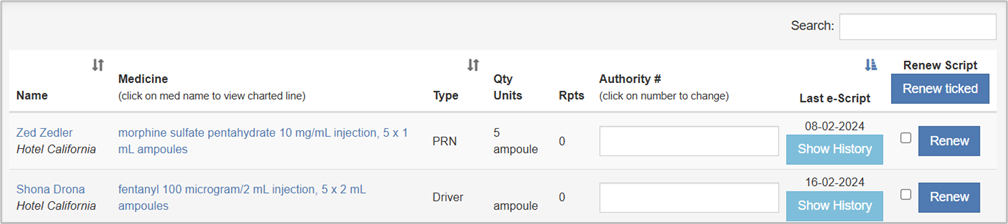 Clicking on the resident’s name will open their medication chart and clicking on Show History will show you the rescripted dates.