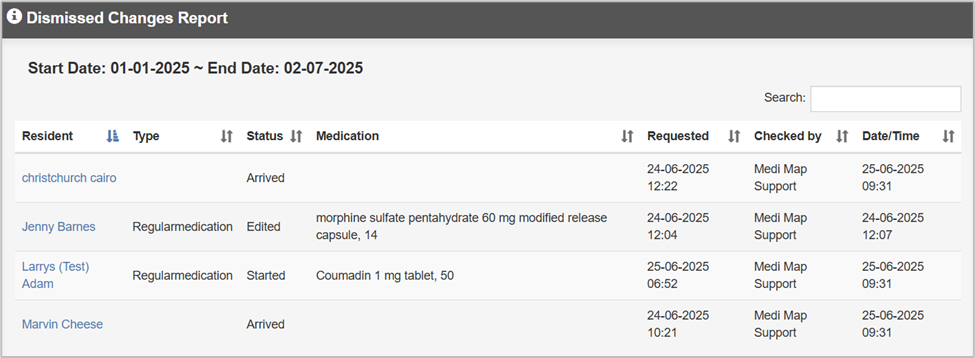 This report allows you search by resident (or leave blank to search by all) and a date range. The report will list the residents and the medication. Click on the resident’s name to open their medication chart.