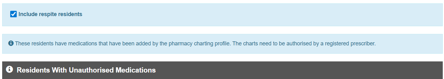 Unauthorised Charts Print Article These are charts where residents have had medications added by the pharmacy and require the Prescriber to authorise the changes. Click on Unauthorised Charts from the dashboard. The report will displayVersion 1.0 Related articles NHI Integration Ward (Imprest) stock orders User Guide - Pharmacy Review and process electronic prescriptions Chart Changes