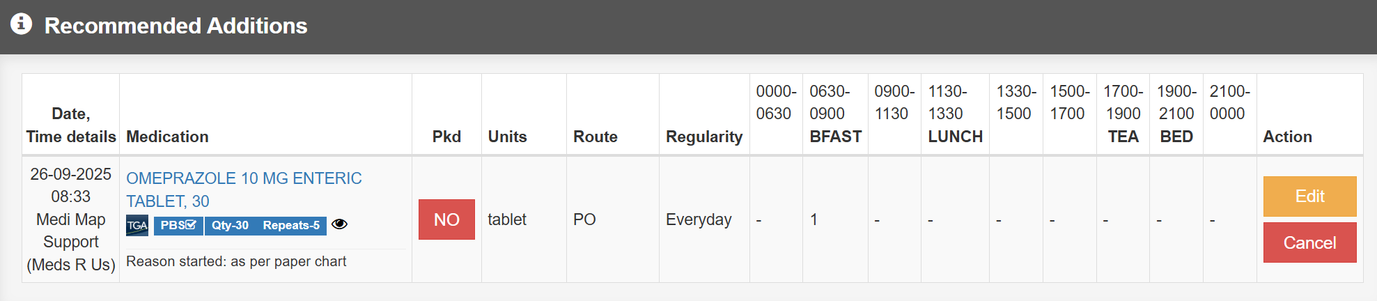 6. The medication will show as a recommendation which can be edited or cancelled until approved by the prescriber.