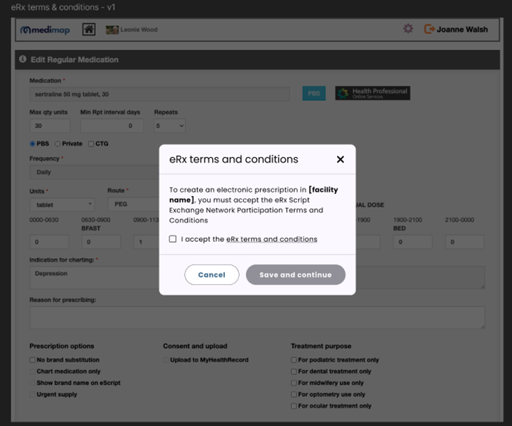 In order to create electronic prescriptions, prescribers must accept eRX terms and conditions for each aged care site. As a result, these terms may need to be accepted more than once, when prescribing for a site for the first time. Once Terms & Conditions ’s have been accepted for the aged care organisation, prescribers can continue with prescribing medications, editing existing orders, reviewing charts and re-scripting as required for all residents in the aged care site.