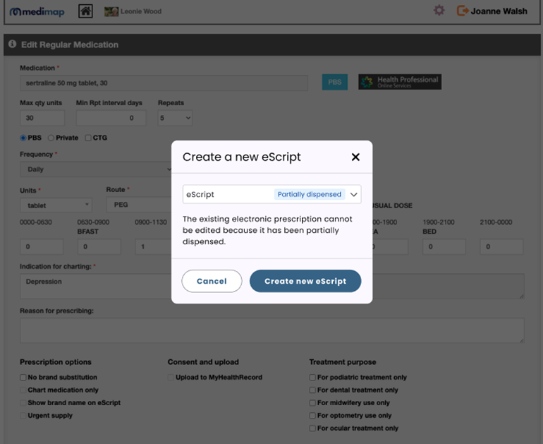 If changes in the active medication chart are needed, when editing a medication line item, please note that for most cases a new barcode will be created and a message with the e-script status will be displayed.