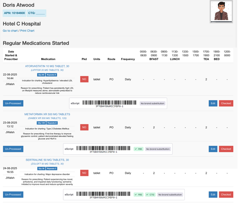 The pharmacy should continue with their current MediMap workflow processes but use the barcode for dispensing medications. Medications without a barcode cannot be dispensed under eNRMC rules when a chart is labelled as Electronic Medication Chart.